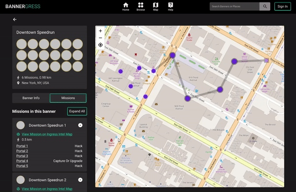 Ingress Mosaik was already gone when the Bannergress project started, but thanks to the magical Internet Archive we were still able to have a sneak peak of what it used to be. To the team, Bannergress is not just a replacement of the old site, otherwise I guess I would not be needed in the project. So we started by looking at things that could have been improved.