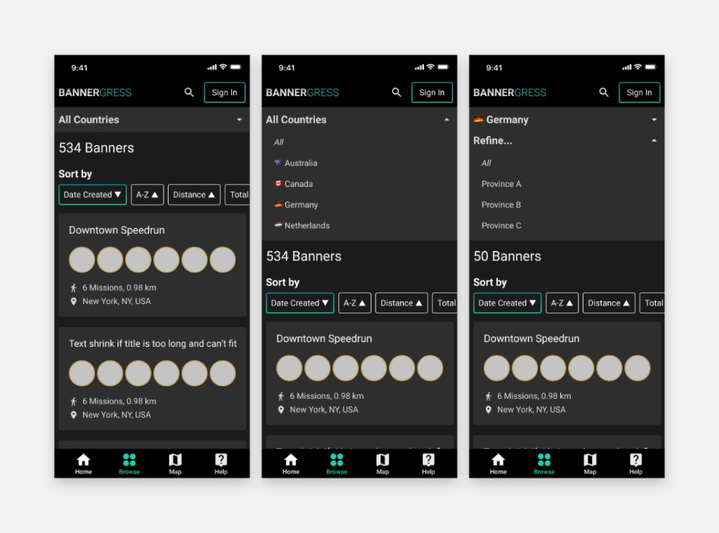 The location drilldown menu was a user favorite in IM, and we iterated on that to create our own take of it in Bannergress. We used different layouts and different interaction logics on the desktop and mobile site, in order to optimize the experience for differnet pointing devices (mouse vs finger).